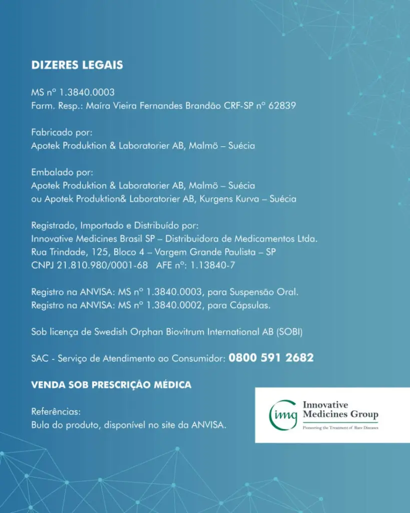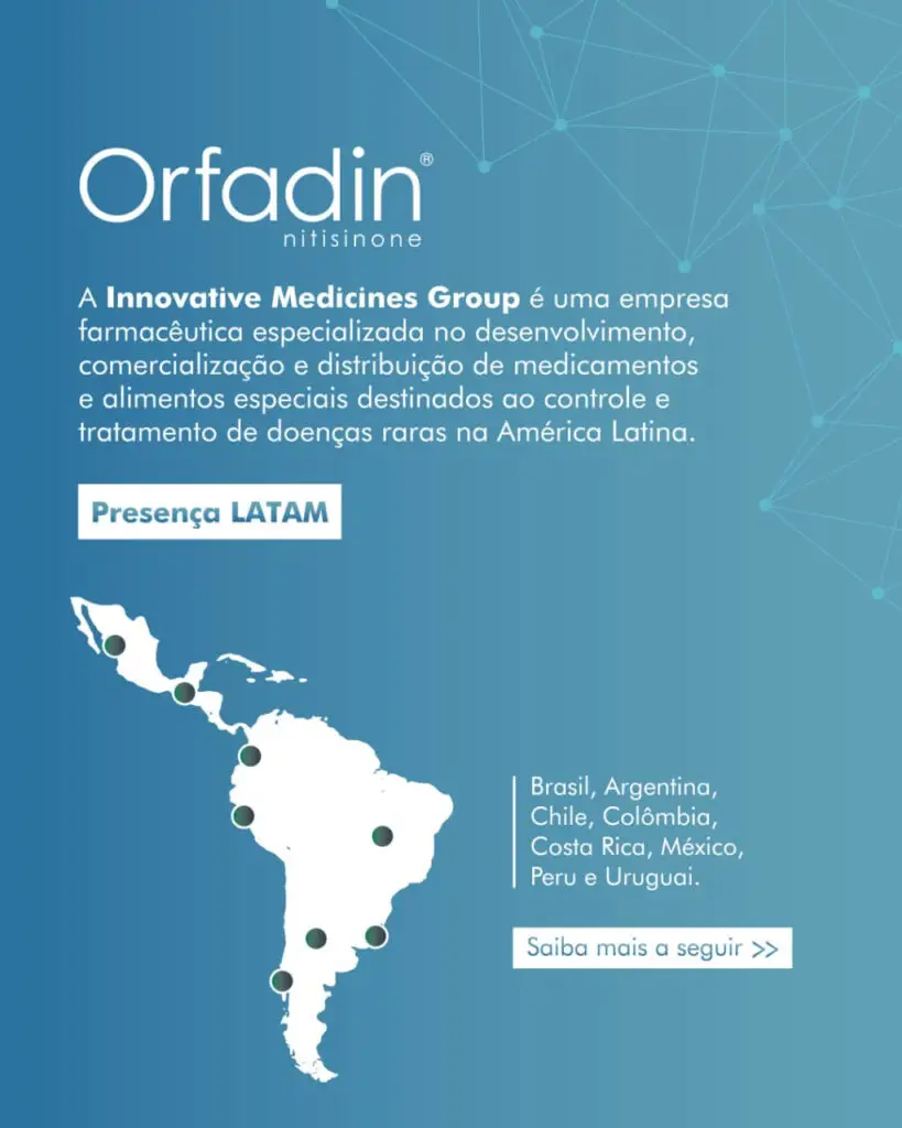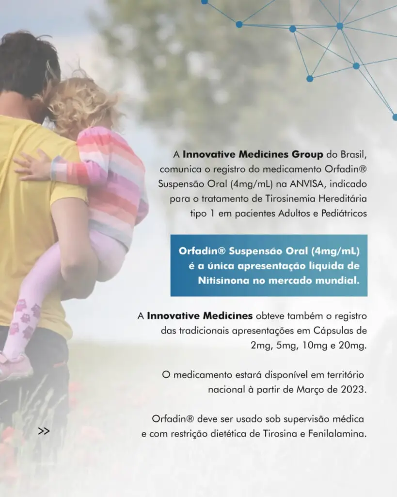 A Innovative Medicines Group do Brasil, comunica a disponibilização do Orfadin® (Nitisinona) Suspensão Oral (4mg/mL), única apresentação líquida no mercado mundial indicado para tratamento de Tirosinemia Hereditária tipo 1 em pacientes Adultos e Pediátricos. Além disso, continuam as tradicionais apresentações de Orfadin® Cápsulas (2mg, 5mg, 10mg e 20mg). As prescrições devem estar em acordo com avaliação médica e em associação com a restrição alimentar de Tirosina e Fenilalamina.